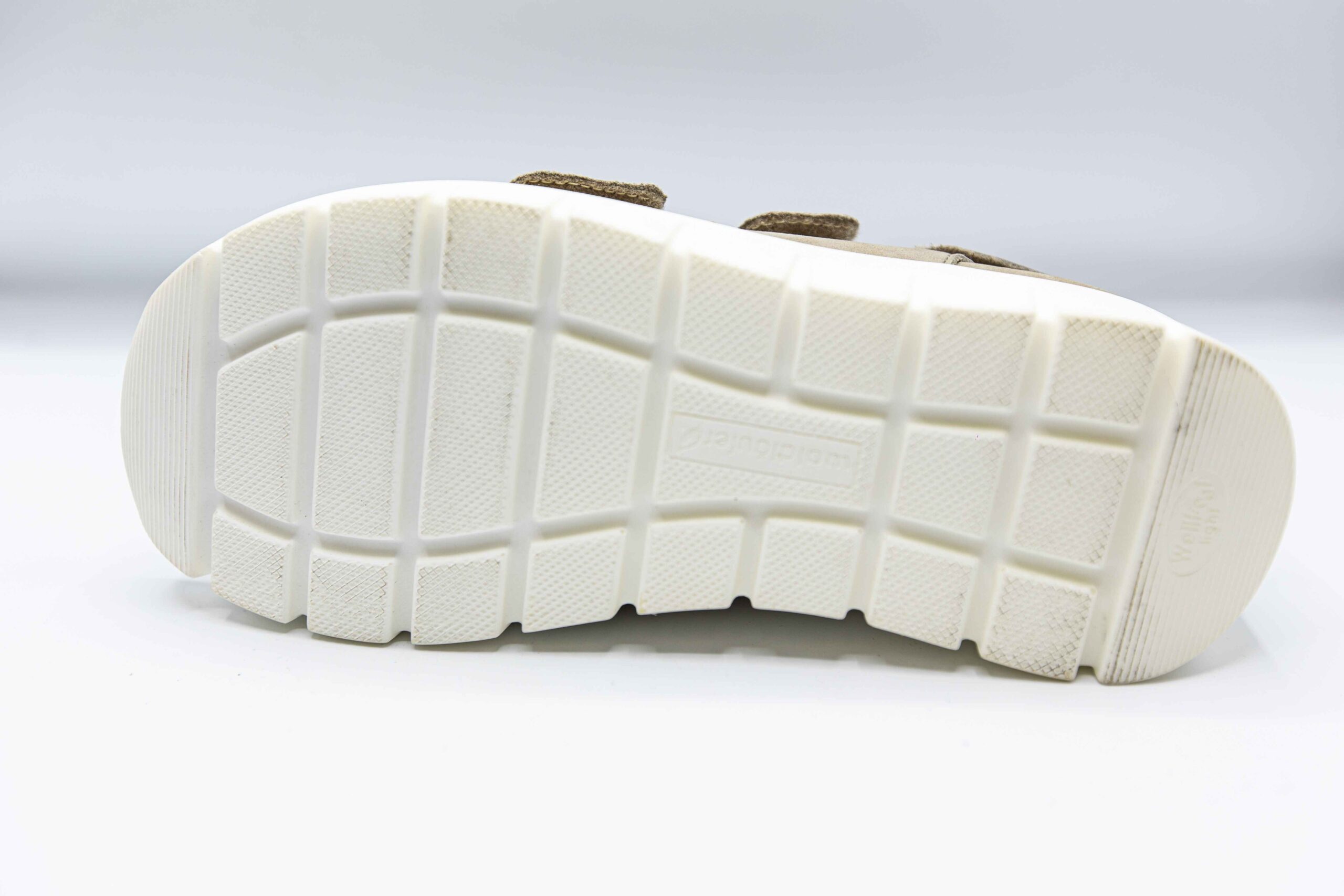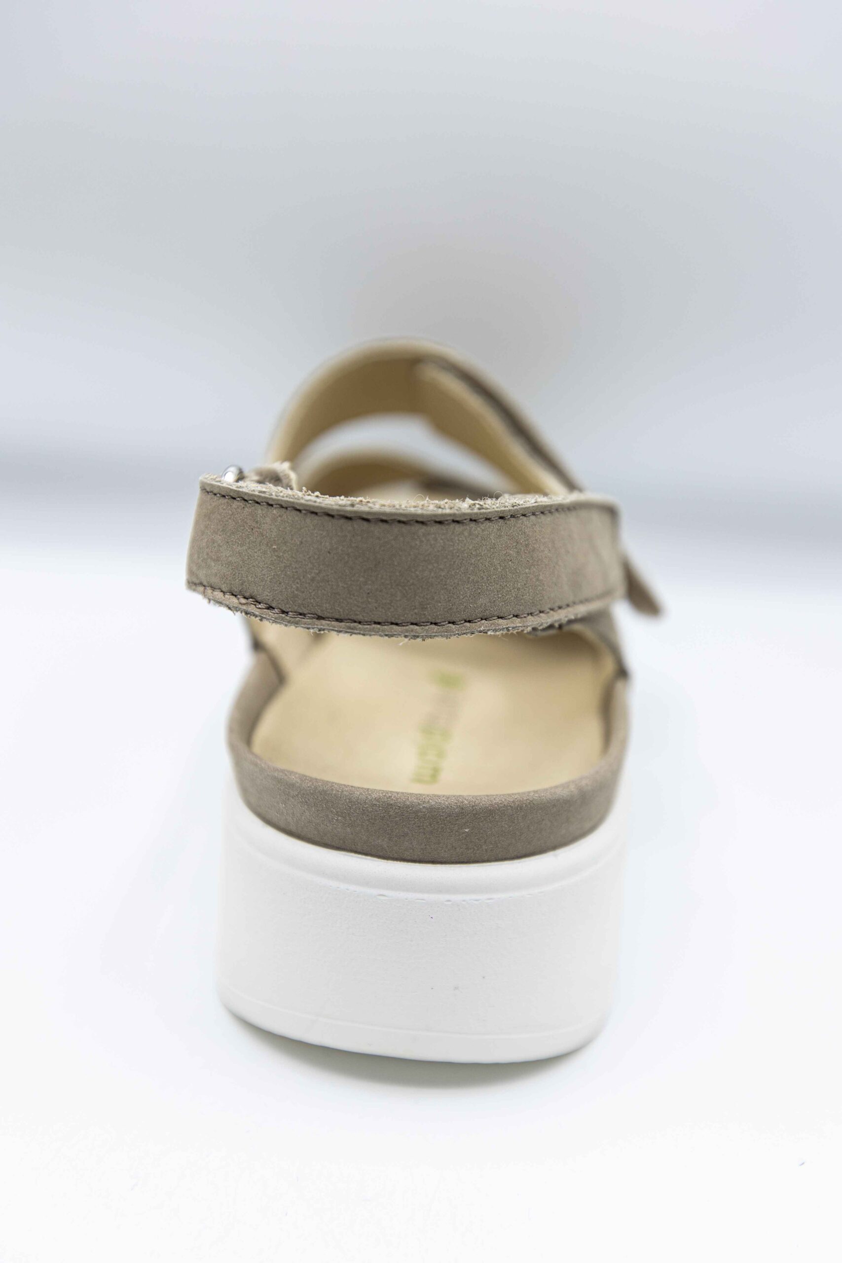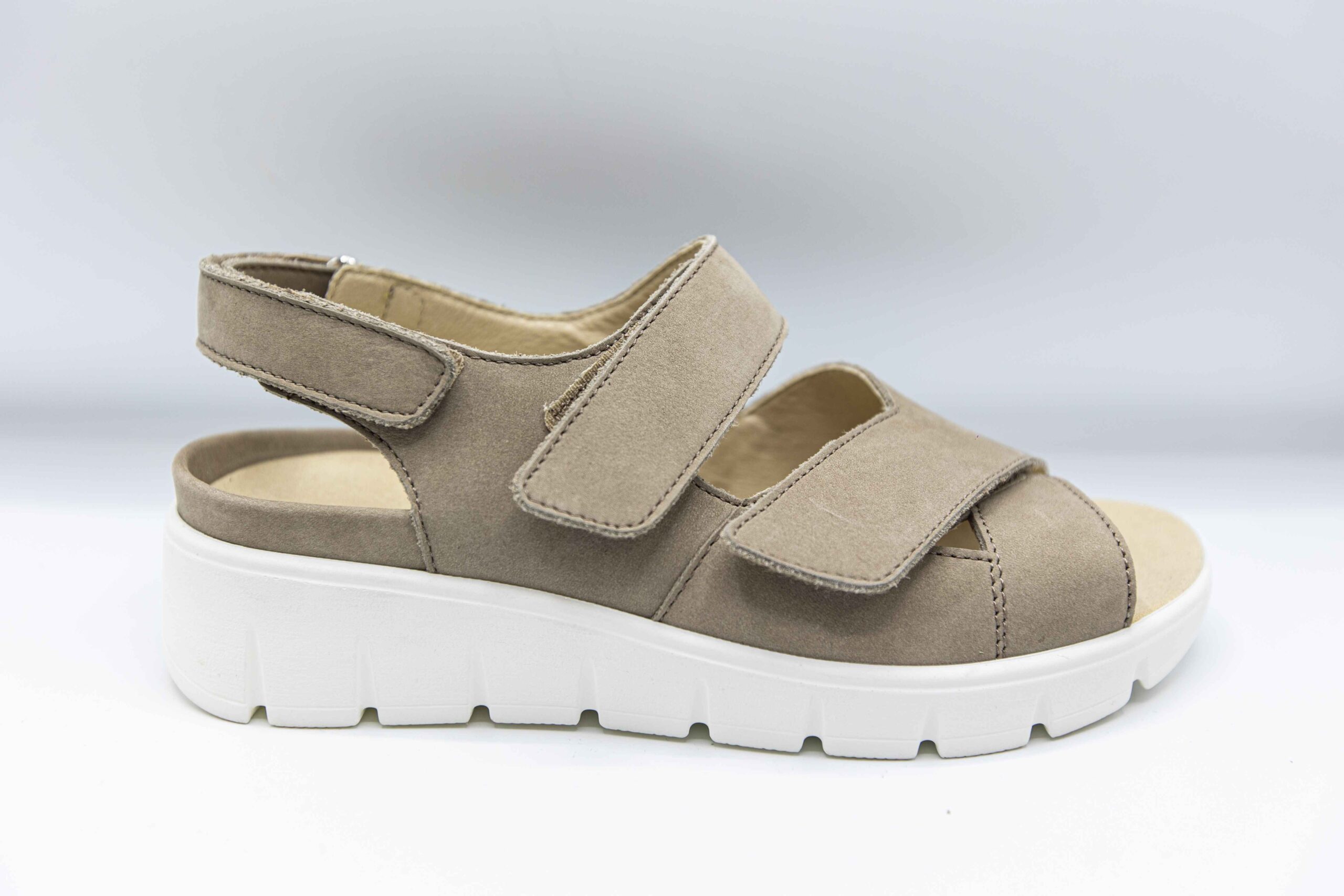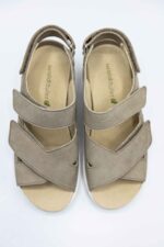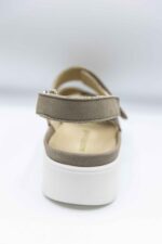 Sandalele de culoare bej sunt din piele nubuk la exterior. Interiorul este captusit cu piele naturala,Branturile sunt moi si detasabile,sistem de inchidere velcro,talpa este usoara si flexibila.