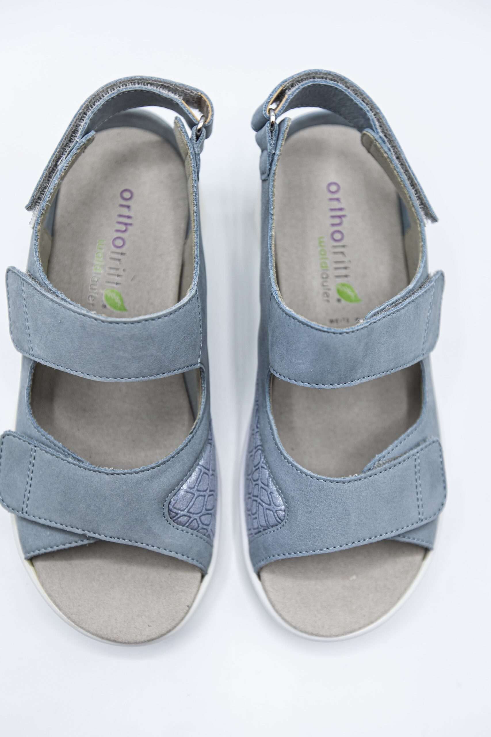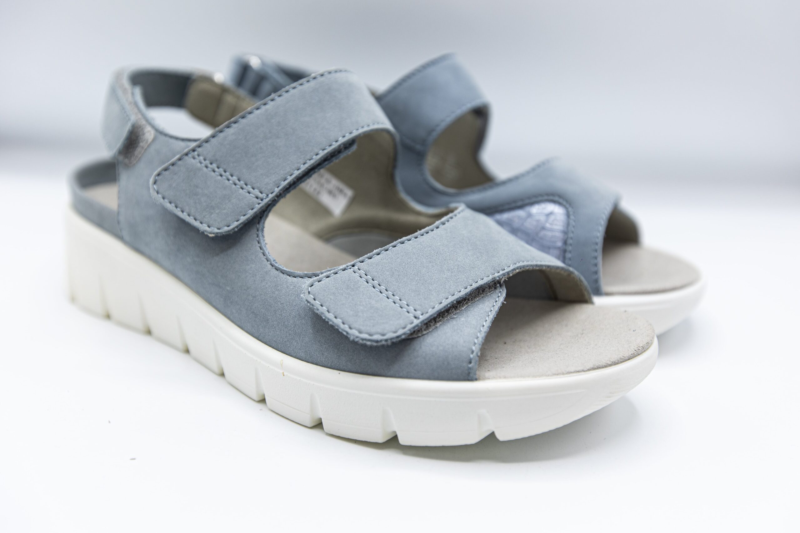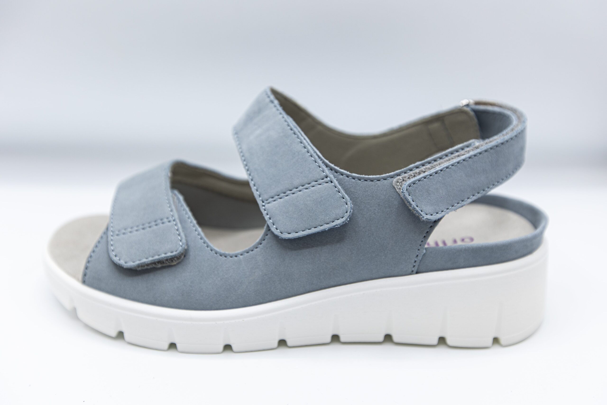 Sandalele de culoare denim sunt din piele nubuk la exterior. Interiorul este captusit cu piele naturala,Branturile sunt moi si detasabile,sistem de inchidere velcro,talpa este usoara si flexibila.